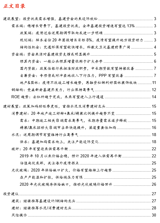 假设20年实际GDP全年增速3%情况下,我们预计全年基建投资增速有望达13%左右。年初地方两会中,17个公布固投目标省份20年固投合计目标增速8%,我们认为疫情后地方投资意愿或增强,投资拉动力量有望由地产转向基建。交通/市政/环保领域投资有望保持较快增长,19年科教文卫类投资增速远高于传统基建,20年有望继续成为拉动投资的重要动力。旧改政策支持力度大,成为后棚改时代对基建的有力补充,建议关注基建及旧改产业链投资机会。从基建回暖及中长期成长两条主线看,建筑继续推荐基建设计/钢结构龙头,建材继续推荐水泥/消费建材龙头。