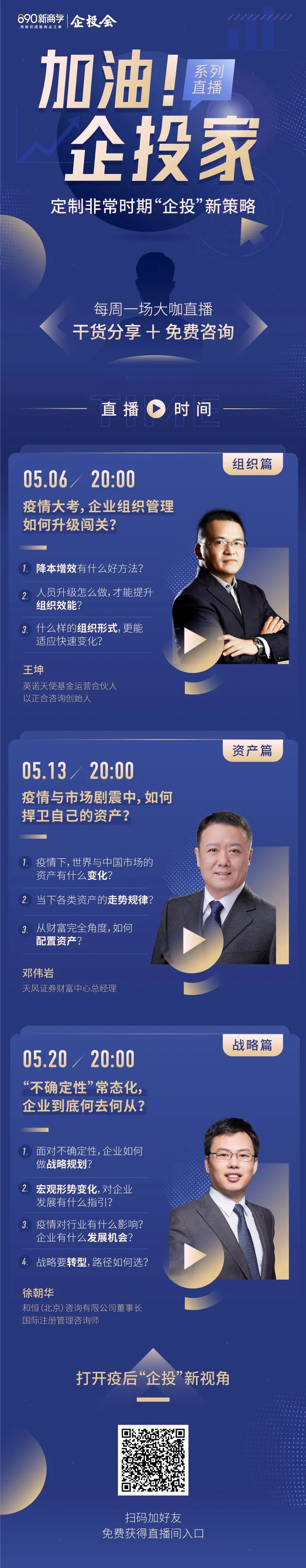 除了王坤老师的“组织篇”直播外,5月13日与5月20日,“加油!企投家”直播还将请到两位大咖导师,分别带来“资产篇”与“战略篇”。