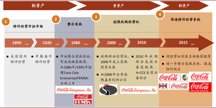 历史演变介绍。可口可乐装瓶商系统并非一成不变,为了更好地进行全球化管理,公司装瓶系统经历轻资产>重资产>轻资产的几次变迁: