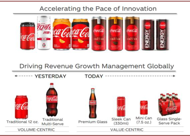 口味多元化,迎合消费者细分需求。公司早期宣扬标准产品,成立近100年并未开发其他口味。随市场上逐渐出现很多餐厅自制樱桃味可口可乐,公司于1985年打破传统,推出樱桃味可口可乐,开始在口味上提供多样化选择,满足不同顾客喜好。樱桃味可口可乐广受美国消费者喜爱,亦成为巴菲特的最爱。2009年,公司开发了自由搭配的自动贩卖机(“Freestyle”),更是提供DIY式的多样化口味。此外,随着近几年从传统的销量导向转为价值导向,公司亦在核心产品包装上进一步精细化区分,打造小包装系列,产品结构提升显著。
