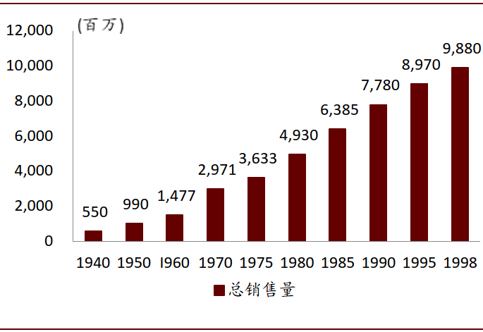 资料来源:《Transformation and continuity the U.S. carbonated soft drink bottling industry and antitrust policy since 1980》,中金公司研究部;注:销售量单位为“单元(Unit Case)”,每单元为5.68升饮料