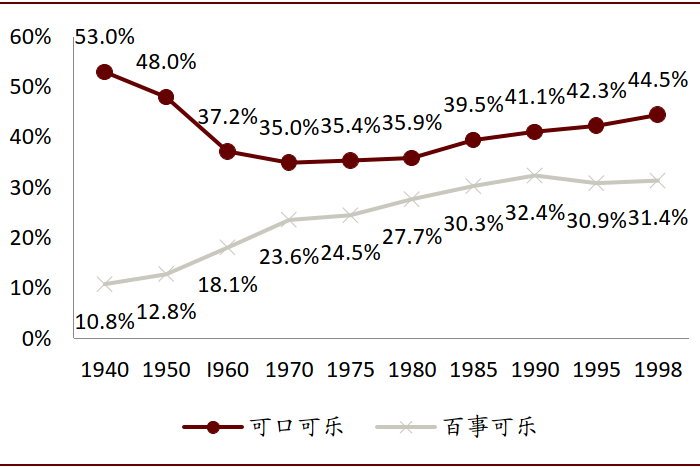 图表: 1940-1998年可口可乐与百事可乐份额变化