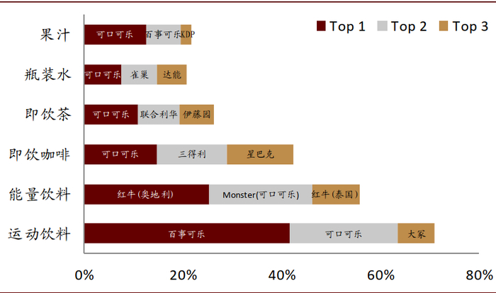 图表: 2019年全球软饮料细分市场Top3市场份额(按零售额计)