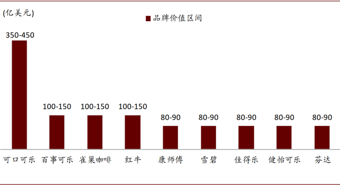 作为全球软饮料龙头,可口可乐的成功既有时代背景助推,亦有公司在产品设计、商业模型选取、品牌打造、全球化和多元化等方面努力,我们认为最基本、最核心要素是公司坚持不懈的营销努力,不仅延长了碳酸饮料品类的生命周期至百年以上,更成功塑造了独一无二的“可口可乐”品牌文化。根据Euromonitor 2017年《全球最成功的100个快速消费品牌》,可口可乐品牌价值区间在350-450亿美元,位列第一,远高于排名其后的百事可乐、雀巢咖啡等企业。