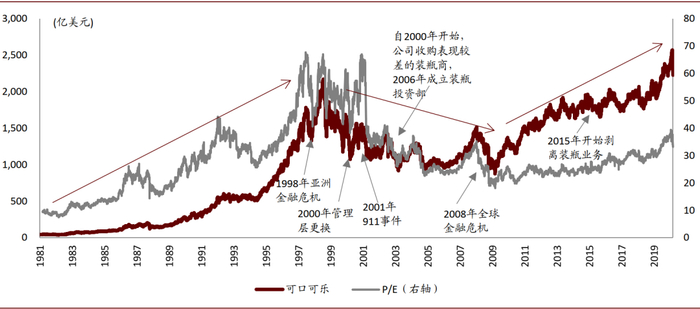 2019年可口可乐实现收入、净利润373亿、89亿美元,近30年复合增速6.7%、11.1%。自1981年公司市值表现可分为快速提升、震荡下行和再度提升三个阶段,主要受ROE波动、净利润增速及外部环境如金融危机等因素影响。历史估值水平在7.4倍至68倍动态P/E间波动,中枢为28.8倍,估值变化主要受国际化拓展、业务调整、销量增长等因素影响。