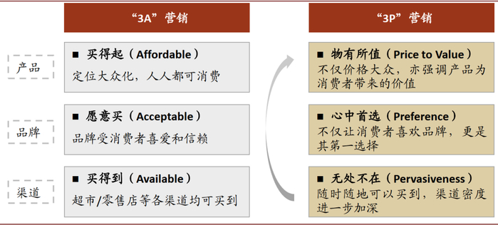 从“3A”到“3P”,品牌力不断强化。营销策略制定过程中,可口可乐自最初“3A”策略,即“买得起(Affordable)、愿意买(Acceptable)、买得到(Available)”,到上世纪80年代转变为“3P”战略,即“物有所值(Price to Value)、心中首选(Preference)、无处不在(Pervasiveness)”。营销策略的转变反映了公司从产品导向到文化与价值观导向的转变,公司追求全方位与消费者建立联系,树立品牌文化、强化品牌认知。