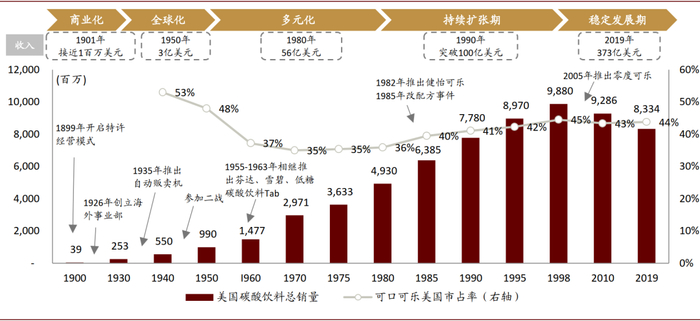 可口可乐公司是全球软饮料市场龙头,其品牌亦是大众消费文化的典型代表。本文通过深度复盘可口可乐公司超过130年成长历程,从品牌营销、全球化、多元化发展三个方面挖掘公司份额持续扩大、品牌影响力不断提升的核心竞争力,为国内饮料企业龙头发展提供参考借鉴。