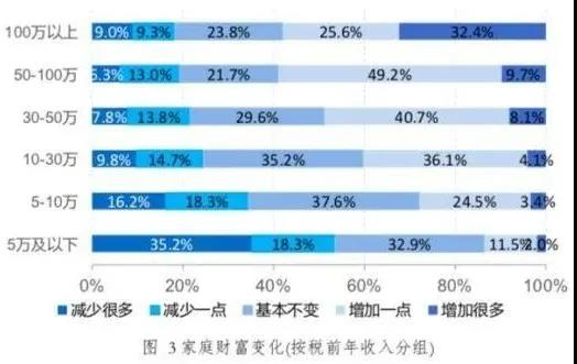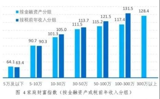 从统计的数值上看,家庭金融资产或年收入10万元是分水岭,在其上,财富增值,在其下,财富缩水,且家庭金融资产或年收入 5 万以下家庭的财富缩水严重,家庭财富指数仅 64 左右。