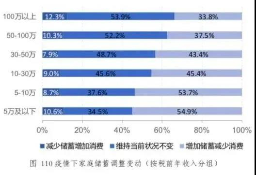 报告的结果显示,不同收入组家庭都调整储蓄、消费计划,尤其低收入家庭增加储蓄减少消费。年收入 5 万及以下的家庭中,有 54.9%的家庭计划增加储蓄减少消费,有 34.5%的家庭计划维持当前储蓄和消费水平。可见,受疫情影响,多数家庭变得不敢消费,低收入家庭尤其如此。