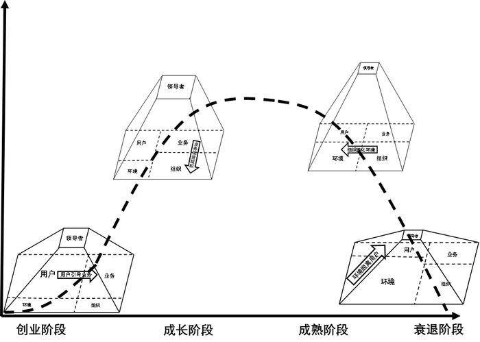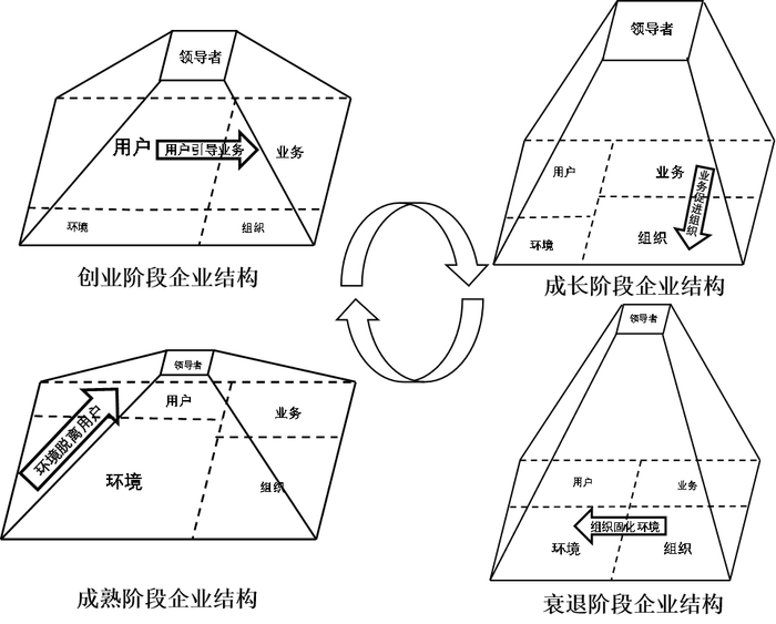 在创业阶段,企业结构扁平,关注用户,重视业务,以用户需求引导业务发展。在成长阶段,企业开始层级化,通过业务发展推动组织成长。进入成熟阶段后,组织规模不断扩大,层级持续增加,对环境和资源的依赖度提高。