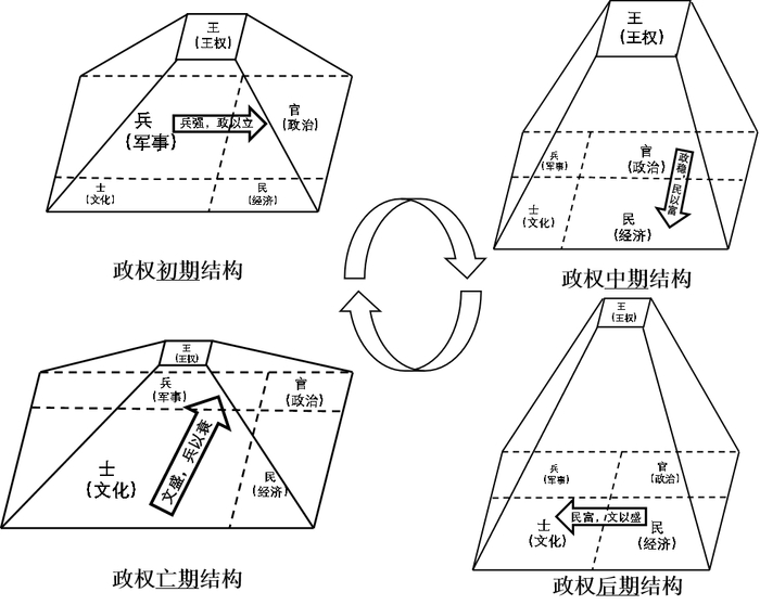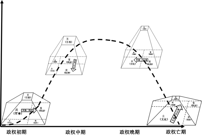 在政权建立初期,政权结构是扁平化的,军事所占比重最大,并且随着“兵强,政以立”政策的推行,逐渐建立稳定的官僚体系;在政权发展中期,政权结构层级化程度上升,王权得到加强,如果没有外部威胁则军事被削弱,且通过“政稳,民以富”实现经济的进一步发展;在政权发展后期,王权得到进一步加强,甚至与官僚体系相脱离,同时,由于“民富,文以盛”使得文化取得较好的发展;当政权进入灭亡期,政治、经济、军事都严重萎缩,只有文化可能呈现一种繁荣的状态。