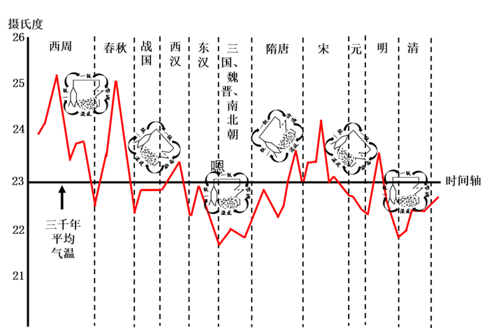 气候变化不仅是人类当前面临的危机,而且一直以来深刻地影响着人类发展的历史。以中国为例,在这片土地上,过去3000年的平均气温为23℃,最高为25℃,最低为21.5℃(图3)。