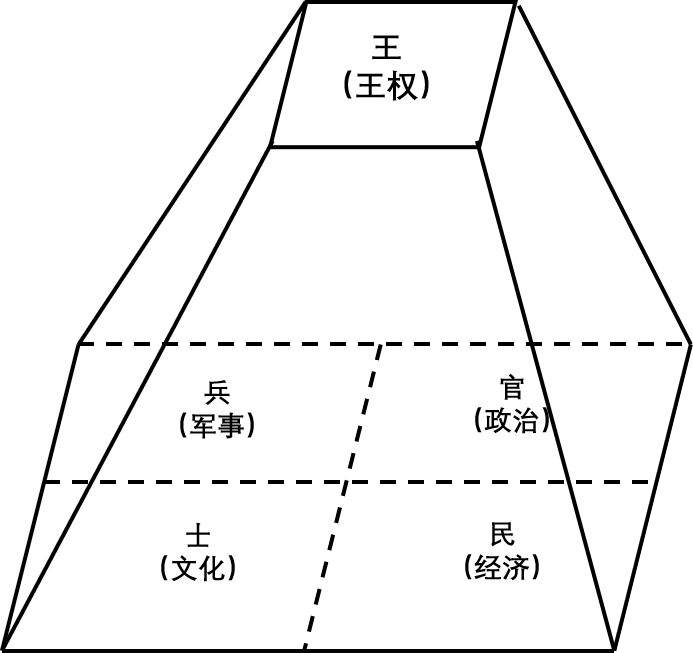 除了王权之外,政权的组成要素主要包括政治、军事、文化和经济等方面。如果进一步简化,政治指代官僚体制,可以用“官”来表示;军事指代国家机器,可以用“兵”来表示;文化指代社会规范,可以用“士”来表示;经济指代财富基础,可以用“民”来表示。于是,政权就由位于金字塔顶端的“王”和位于金字塔塔身和塔基的“官”、“兵”、“士”、“民”构成。