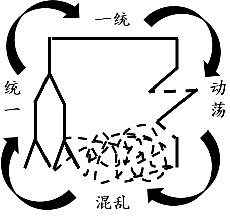 从元末明初的政权危机和政权更替中,我们可以总结出一个在历史上不断重复的规律,即:一个“一统”天下的政权经历多年稳定之后,先是内部各种势力相互斗争出现“动荡”,再是经受外部势力的冲击,随后进入“混乱”状态,最终有一方势力获胜,形成新的“统一”,进入另一个一统天下的循环(图2)。