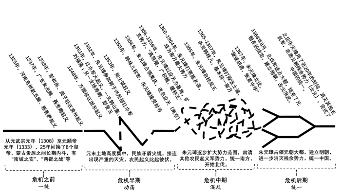 元末明初的历史进程体现了政权危机从“一统”到“动荡”,再到“混乱”,最后重新“统一”的过程,涉及军事、政治、经济、文化等各个方面,不仅可以帮助我们理解政权危机的周期,也可以让我们以此为基础更好地理解企业发展的周期性危机(图1)。