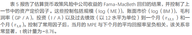 表3中的结果与以下观点一致:货币政策主要是经济的稳定器,而不是驱动器。在负面经济冲击之后,货币政策可能是扩张性的,这会增加消费和财富的边际价值。在这种观点下,MPE因子应该是股票横截面回报的强烈负面预测指标,这正是我们在数据中观察到的。MPE因子值较低的股票(即在出现扩张性货币政策意外时往往表现不佳的股票)的平均收益要明显高于MPE因子值较高的股票(即那些在出现扩张性货币政策意外时往往表现良好)。
