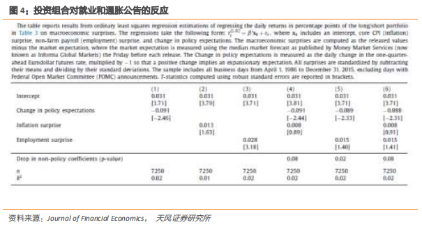 表4报告了根据政策预期变化以及就业和CPI意外变化对多头/空头(低-高MPE)投资组合的每日投资组合收益进行回归得出的估计。