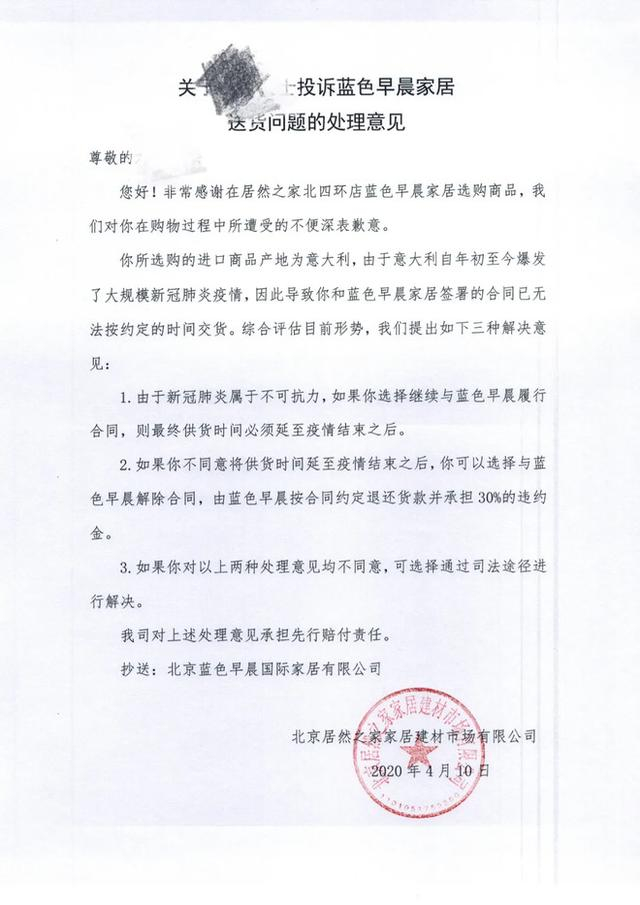居然之家提出,一是以疫情为不可抗力为由,把送货时间再度延后到疫情结束后;二是解除合同,由蓝早退还货款并承担30%违约金;三若均不同意,可走司法途径。