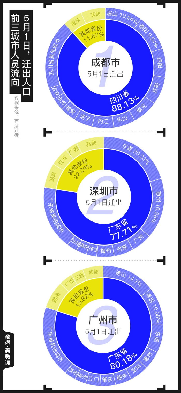 离开本地的人群都去了哪儿?澎湃新闻根据百度迁徙指数,以五月一日迁出人群规模最大的成都、深圳、广州三个城市为例,统计了迁出人口的流向。