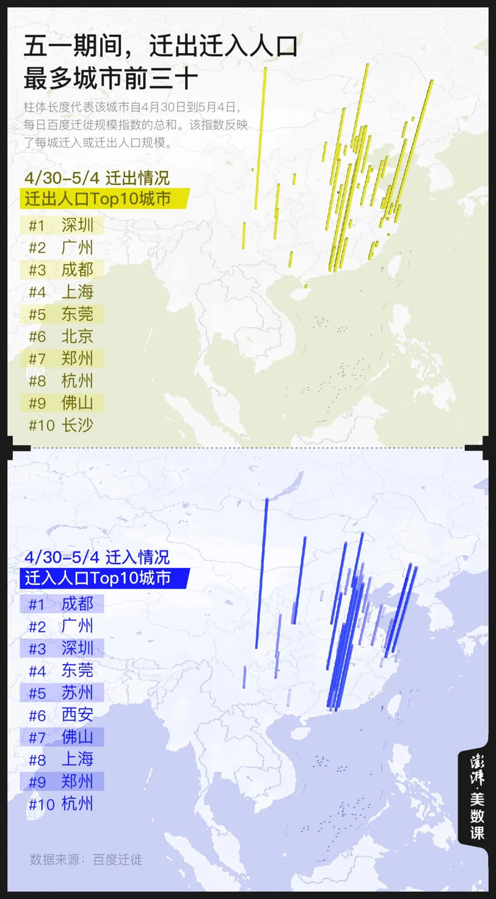 五一期间,哪些城市的人们出行到外地的规模最大?这些城市迁出的人群,最终又去了哪儿?
