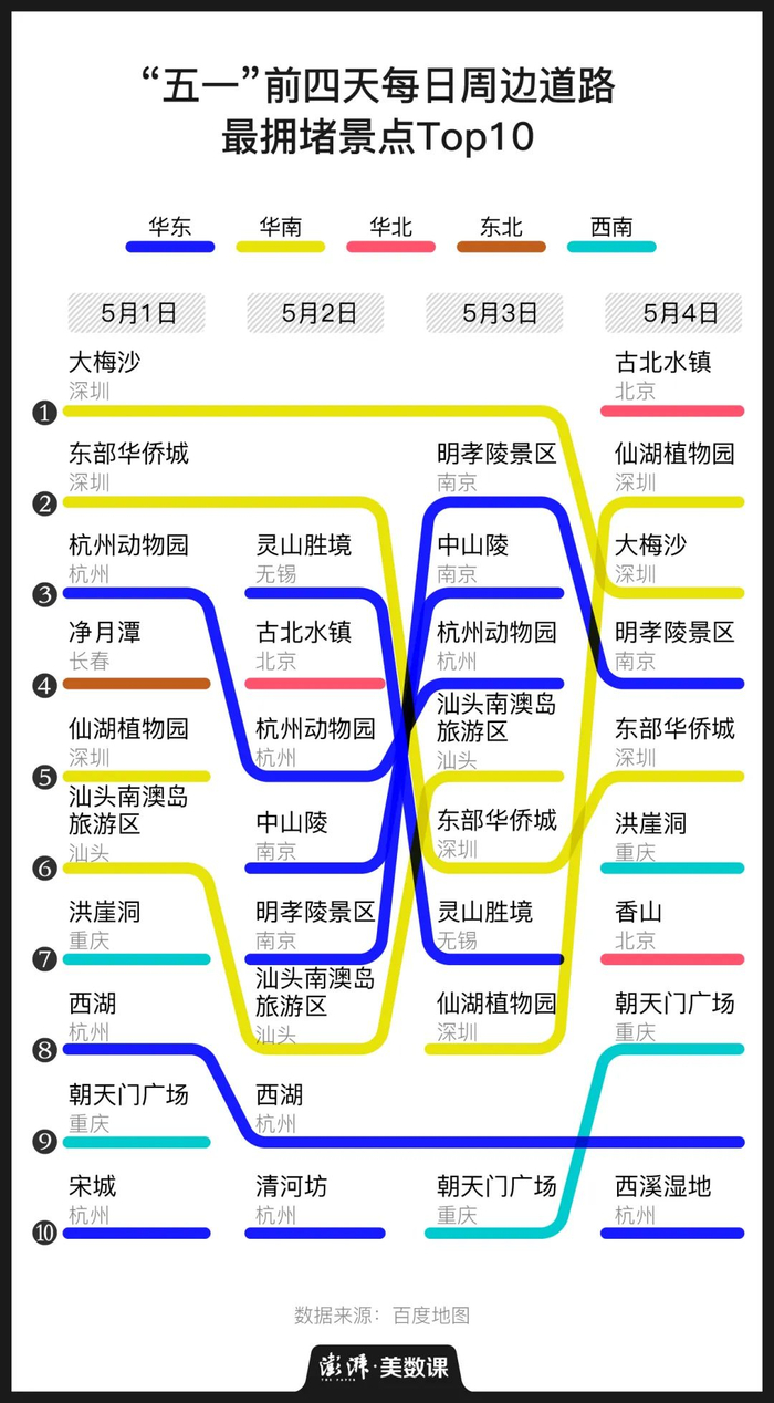 5月1日到5月4日,每一日百度地图都发布了“全国周边道路最为拥堵的top10景区”排行榜,4天中,深圳的大梅沙、仙湖植物园、东部华侨城,杭州的西湖以及南京的明孝陵频繁“上榜”。