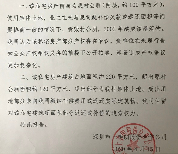 在该房产拍卖信息公示后,该私宅所在地的深圳市上李朗村股份合作公司向福田区人民法院反馈,公开拍卖的上李朗村私宅,前身为村中公厕,共有两层,约100平米,使用的是村集体土地。业主在没有和上李朗村公司协商一致的情况下,就拆毁村公厕,2002年建成该建筑物。