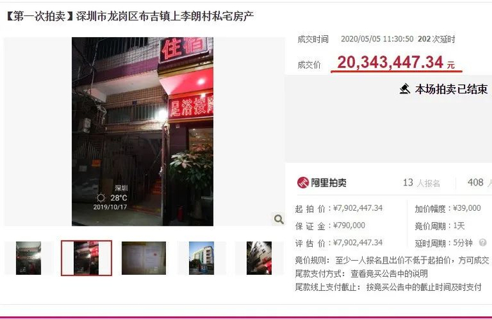 5月5日,郑永彬在13名报名者中脱颖而出,阿里拍卖平台上拍得了“深圳市龙岗区布吉镇上李朗村私宅房产”,成交价为20343447.34元。
