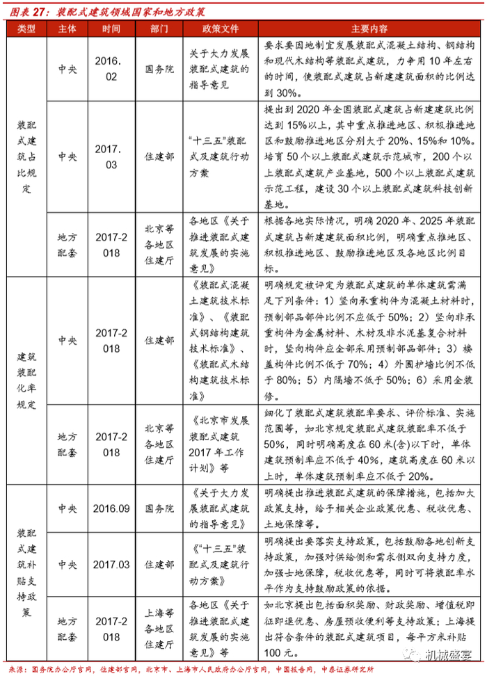 近年来,我国政府出台了一系列政策支持装配式建筑行业发展。2016年2月国务院出台《关于大力发展装配式建筑的指导意见》要求要因地制宜发展装配式混凝土结构、钢结构和现代木结构等装配式建筑,力争用10年左右的时间,使装配式建筑占新建建筑面积的比例达到30%。2017年3月住建部出台《“十三五”装配式及建筑行动方案》,提出到2020年全国装配式建筑占新建建筑比例达到15%以上,其中重点推进地区、积极推进地区和鼓励推进地区分别大于20%、15%和10%。京津冀、长三角、珠三角三大城市群为重点推进地区,常住人口超过300万的其他城市为积极推进地区,其余城市为鼓励推进地区。