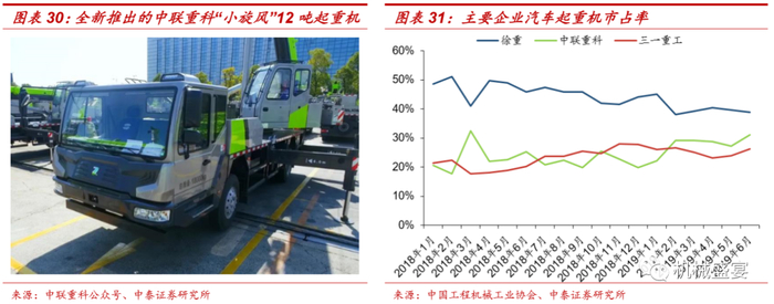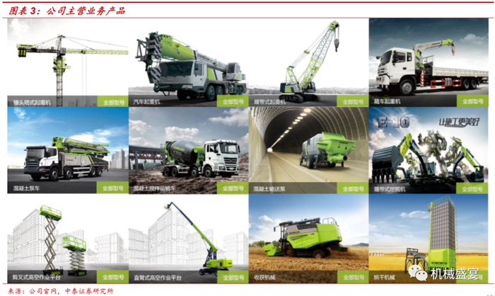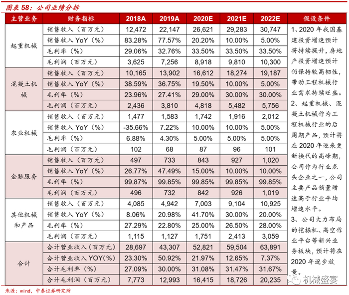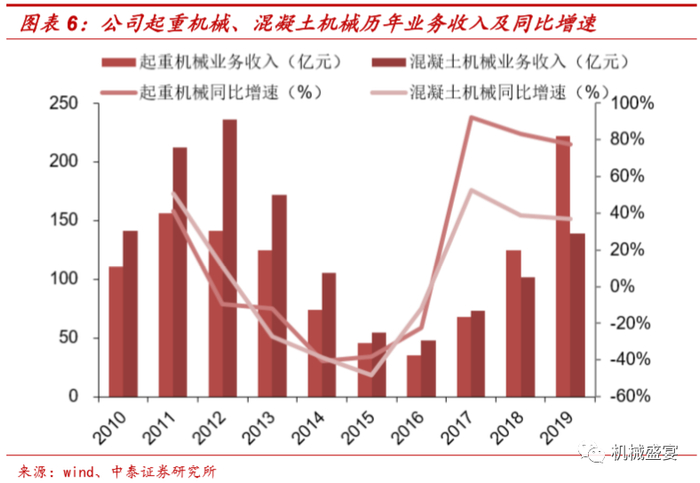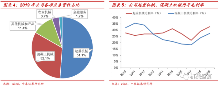 ①公司是我国工程机械行业龙头企业之一。主营业务产品包括起重机械、混凝土机械、土方机械、高空机械、农业机械等诸多品类。目前,公司起重机械、混凝土机械产品市场份额持续保持“数一数二”,其中建筑起重机械销售规模实现全球第一。2019年,公司产品线销售职能回归事业部后,市场竞争优势进一步增强。2019年,公司起重机械、混凝土机械合计营收占比高达83%,未来伴随着工程机械后周期产品复苏高峰的来临,公司业绩持续高增长可期。