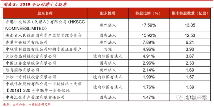 公司无控股股东或实际控制人。2008年12月31日前,公司控股股东为长沙建设机械研究院有限责任公司,自2008年12月31日建机院注销后,湖南省国资委为公司第一大股东。2012年2月27日,湖南省国资委明确将公司界定为国有参股公司,据此公司无控股股东或实际控制人。截至2019年12月31日,公司第一大股东为香港中央结算(代理人)有限公司,持有公司17.6%股份;湖南省国资委持有公司15.9%股份,为公司第二大股东。