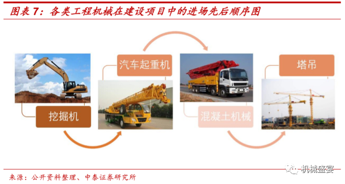 上一轮工程机械销售高峰期位于2008年11月至2011年9月。2008年金融危机后,我国政府出台了“四万亿”的经济刺激政策,在此期间,房地产和基建投资加大,对各类工程机械产品的需求持续提升。在建设项目中,挖掘机是率先使用的工程机械,是工程机械行业复苏的先行指标;其次是汽车起重机,混凝土机械和塔吊等。一般而言,一台挖掘机的使用寿命在8年左右,2016年底至2019年挖掘机进入存量设备更新换代高峰期,这也直接加速了工程机械行业的复苏。而汽车起重机、混凝土机械、塔机等作为工程机械后周期产品,复苏滞后于挖掘机,而且其寿命大概在10年左右,预计其更新的高峰期未来几年将会持续。