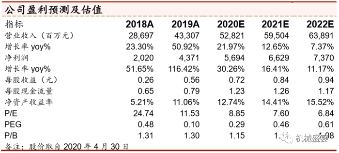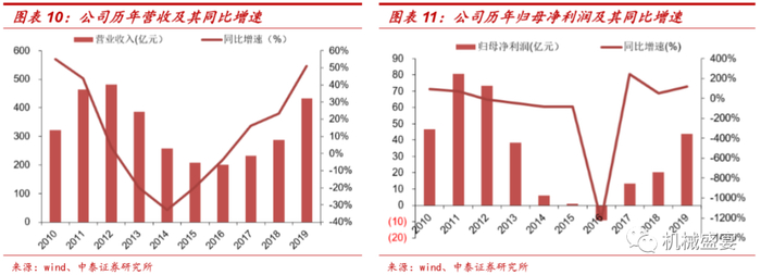 公司是我国工程机械行业龙头企业之一。2019年,公司实现营收433.1亿元,同比增长50.9%;实现归母净利润43.7亿元,同比增长116.4%。公司业绩持续高增长,经营质量达到历史最好水平。2020年一季度,公司营收和归母净利润实现逆势增长,业绩增速明显高于行业平均增速。2019年,公司产品线销售职能回归事业部后,市场竞争优势进一步增强。2020年,基建投资增速预计将持续提升,房地产投资增速仍具备较高韧性,带动工程机械需求旺盛。2020年工程机械后周期产品迎来复苏高峰期,公司起重机械、混凝土机械等后周期产品营收占比高达83%,主业优势明显。另外,公司战略布局挖掘机械和高空作业平台,将为公司未来业绩提供新的增长点。我们预计公司2020-2022年的归母净利润分别为56.9、66.3、73.7亿元,当前股价对应的PE分别为8.9、7.6、6.8倍,对应的PB分别为1.2/1.1/1.1倍。公司估值水平相比三一重工、徐工机械等同行企业较低,具有较高的安全边际和投资价值。首次覆盖,给予“买入”评级。