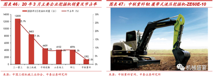 ①挖掘机市场行情火爆,中联重科挖掘机业务快速提升。2019年,挖掘机销售23.6万台,同比增长15.9%,再创历史新高。2020年3月挖掘机销售4.9万台,创单月历史新高。4月以来,各大主机厂均发布了挖掘机产品的涨价通知,挖掘机市场进入量价齐升阶段,高景气度持续。2019年以来中联重科大力布局土方机械,2020年3月挖掘机市占率达2.8%,后发优势初显,未来有望成为公司的强力增长点。