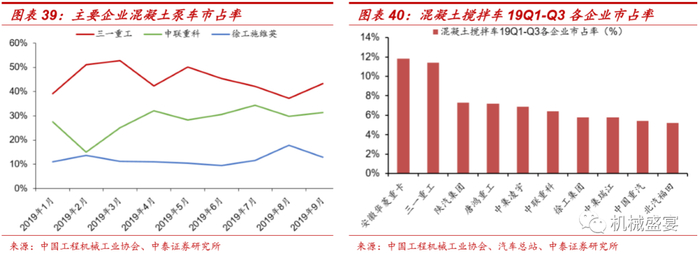 混凝土泵车市场三一、中联双寡头垄断。2019年前三季度,三一、中联两家企业混凝土泵车市占率高达75%左右;三一、中联、徐工施维英(徐工集团与德国施维英的合资公司)三家企业市占率接近90%。预计2019年全年三一、中联混凝土泵车合计市占率在80%左右,2020年一季度可能达到85%左右,混凝土泵车市场集中度未来或将进一步提升。