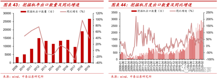 预计2020年挖掘机市场仍将保持稳定增长。自2016年底复苏以来,挖掘机市场景气度持续高涨,目前已历经连续三年的快速增长,虽然存量设备的集中更新换代接近尾声,但房地产、基建和“一带一路”出口等需求的拉动依然不减,挖掘机国四标准即将出台,环保政策愈发趋严,叠加美丽乡村建设如火如荼,机器代人经济性显现,预计到2020年挖掘机销量仍将维持高位,但增速或将放缓。2020年初,受新冠肺炎疫情影响,2月复工延迟,挖掘机需求整体后移一个月左右;2020年,工期压缩带来需求集中释放,叠加基建投资预计将会上扬,带动挖掘机市场景气度持续高涨,我们预计2020年挖掘机销量增速大概在0-10%左右。