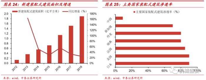 中国新建装配式建筑面积快速增长,但渗透率依然较低。2018年,我国新建装配式建筑面积1.9亿平方米,同比增长25.0%,占房屋新开工面积的比重提升至9.1%,而在2012年该比例还不足1.0%。在渗透率方面,日本、美国装配式建筑渗透率高达90%,法国为85%;中国与欧美日等发达国家相比,装配式建筑的渗透率依然较低。