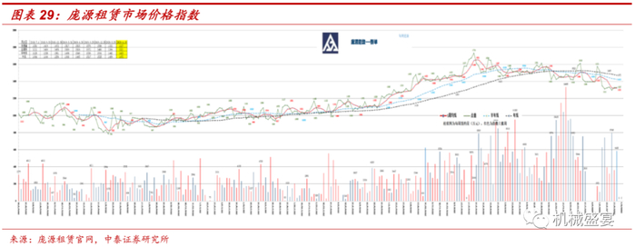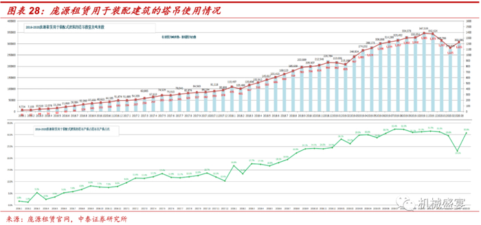 塔机生产厂商的客户主要为租赁商,庞源租赁为我国塔机租赁领域龙头企业。根据庞源租赁公布的数据显示,近年来,庞源租赁用于装配式建筑的塔机数量及吨米数基本呈现不断上升的态势,2020年初受疫情影响小幅回落。庞源租赁用于装配式建筑的塔机产值占塔机总产值的比重也呈现持续上升态势,2020年3月,这一比重达到30.8%,相比2016年1月份的1.8%大幅提升。另外,庞源租赁市场的价格指数基本呈现持续提升的状态,近年来塔机租赁价格不断上扬,塔机市场量价齐升,景气度持续高涨。