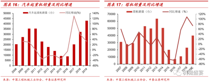 起重机械包括汽车起重机、塔式起重机、随车起重机、履带式起重机、全地面起重机、越野轮胎起重机等系列。各类起重机械产品均在2017年开始复苏,在2008-2011年销售的大量起重机械预计将在2020年前后进入更新换代的高峰期。