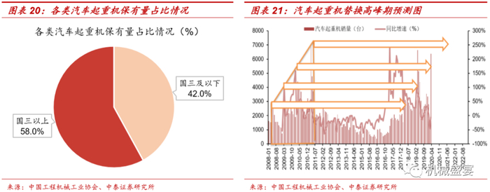 另一方面,环保政策的趋严,不符合排放标准的落后机型有望加速出清,也将有力推动替换潮。而在2008-2011年销售的大量起重机大部分为国三标准,目前汽车起重机国六标准逐步实施,也将带动产品的更新替代。当前汽车起重机国三及以下的产品保有量占比高达42.0%,未来伴随着国三标准车辆在市场上的逐步退出,更新需求也有望持续进行。