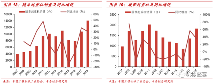 2018年,随车起重机销售1.4万台,同比增长30.7%。随车起重机销售创历史新高。2018年,履带式起重机销售1828台,同比增长35.0%,销量增速维持高位。