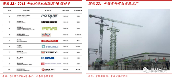 塔机市场中联重科市占率高达40%左右,国内龙头地位稳固。在《中国工程机械》杂志发布的2018全球塔式起重机制造商10强榜单中,中国有中联重科、徐工、永茂控股三家企业上榜。2018年,中联重科并购德国威尔伯特,进军欧洲高端塔机市场,进一步巩固了公司的全球塔机龙头地位。威尔伯特是一家在建筑行业有着80余年历史的老牌企业,是全球领先的变幅式动臂塔机制造商以及欧洲排名第三的塔机租赁商,在高端起重机领域欧洲市场占有率第一,其大型塔机的起重能力、精度及安全性在欧洲首屈一指。