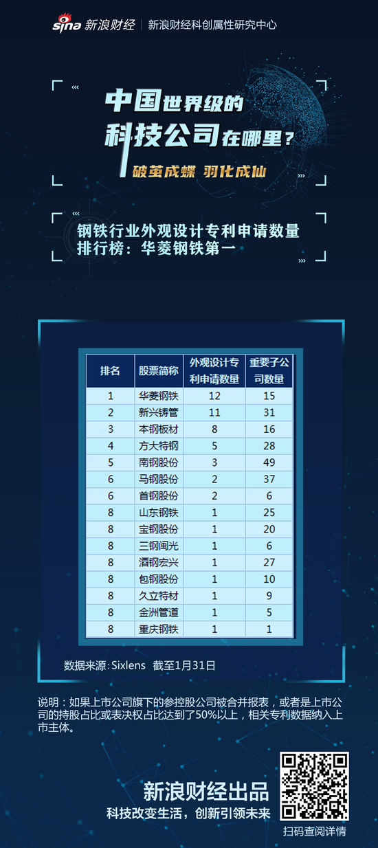 钢铁行业外观设计专利申请量排行榜:华菱钢铁第一