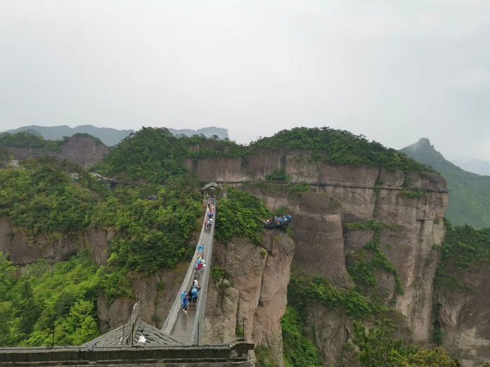 出游前,记者在网络上查阅了一些攻略。得知原来神仙居景区就是大名鼎鼎的天姥山,李白著名的《梦游天姥吟留别》中“天姥连天向天横,势拔五岳掩赤城”所描绘的就是这座云山雾罩的仙山。往年的旅游攻略中可见山中游客成群,摩肩接踵,排队等待搭乘上下山缆车的队伍蜿蜒几十米,吊桥上的人们排着队缓慢通过,山间的大风丝毫不能将其撼动。