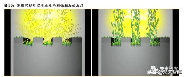 薄膜沉积:与刻蚀方向相反,同样为推动先进工艺关键设备。与刻蚀通过等离子气体与 被刻蚀对象进行物理或化学反应,形成高挥发性物质并将其带离晶圆表面不同,薄膜沉积则 是通过向晶圆表面推送气相物质,在晶圆表面发生物理或化学反应,形成膜层的过程,与刻 蚀属于方向相反的反应过程,同样是推进逻辑芯片先进制程与 3D NAND 极高深宽比工艺的 关键。在刻蚀工艺中的侧壁钝化等技术其实也是一种薄膜沉积。