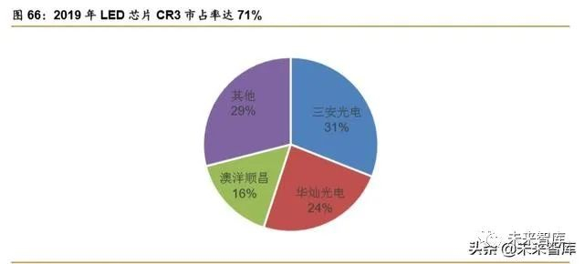 2019 年国内 LED 芯片市场规模约为 241 亿元,CR3 市占率达 71%。随着产业链聚拢 度的增大,LED 延芯片也愈发向更高标准化、更大规模化的趋势发展,需要做到规模化满 足差异化需求的快速低成本响应,处于领骑集团的巨头们又在竞相扩产。根据前瞻产业研究 院数据显示,我国 LED 芯片领域市场集中度较高,三家企业的市占率高达 71%。其中,三 安光电的市场份额最高,占比达 31%,华灿光电、澳洋顺昌其次,占比分别为 24%、16%。按照三安光电 2019 年 74.6 亿元营收测算,则我国 LED 芯片市场规模为 241 亿元。