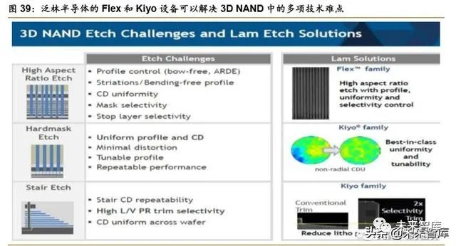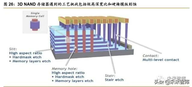 硬掩膜版刻蚀、极高深宽比刻蚀和阶梯刻蚀成为 3D NAND 制造难点。NAND 型闪存一 直致力于缩小关键尺寸,增加单位面积存容量的研究,以缩减制造成本。2D NAND 主要依托光刻技术实现光刻等比例缩放存储器单元的尺寸。但是随着关键尺寸缩小面临的瓶颈,传 统缩减成本的方法已经显得不是很有成效。为了维持目前的成本缩减速度,工业界转用 3D 技术在单一硅片上堆纵向叠闪存芯片,对于 3D NAND 来说,挑战从光刻转移到薄膜淀积和 刻蚀技术。从刻蚀角度来说,主要难点包括硬掩膜版刻蚀(Hardmask etch)、极高深宽比刻 蚀(HAR)和阶梯刻蚀(Stair etch)。