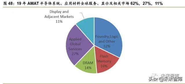 注重解决方案销售,多元化发展强化抗风险能力。1977 年应用材料的咨询顾问鲍勃提 出了解决方案市场的概念,主张收集客户面临的特定应用程序的问题,用特定的设备提供独 特的解决方案,以优化设备的性能、提高工厂的生产力为目的,从设备制造商到方案供应商 的转变奠定了应用材料未来经营方向,即主攻晶圆加工设备制造以及辅助的客户解决方案销 售。90 年代后期,在经历了互联网泡沫破裂、亚洲金融危机等事件影响的公司认识到周期对 半导体设备公司强大的影响力,开始通过并购拓展在半导体设备和泛半导体设备领域的布局, 增强公司业务抗风险性。2019 年,公司半导体系统、应用材料全球服务、显示及相关市场 62%、27%、11%,公司泛半导体产业布局已经形成。