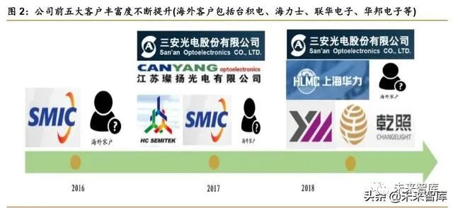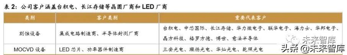 客户涵盖国内外主流晶圆厂和 LED 制造商,客户认可度和丰富度不断提升。公司目前 已成为多家 IC 制造、半导体封测和 LED 芯片制造主流企业的供应商,刻蚀设备领域客户包 括台积电、中芯国际、联华电子、华力微电子、海力士、长江存储、华邦电子、晶方科技、 格罗方德、博世、意法半导体等,MOCVD 设备客户代表包括三安光电、璨扬光电、华灿光 电、乾照光电等。随着公司收入规模增大,新产品不断丰富,公司产品在 IC 制造、封测和 LED 产线中渗透情况提升,从公司 16-18 年前五大客户变化趋势可以看出公司客户结构不断 丰富,产品的客户认可度不断提升。