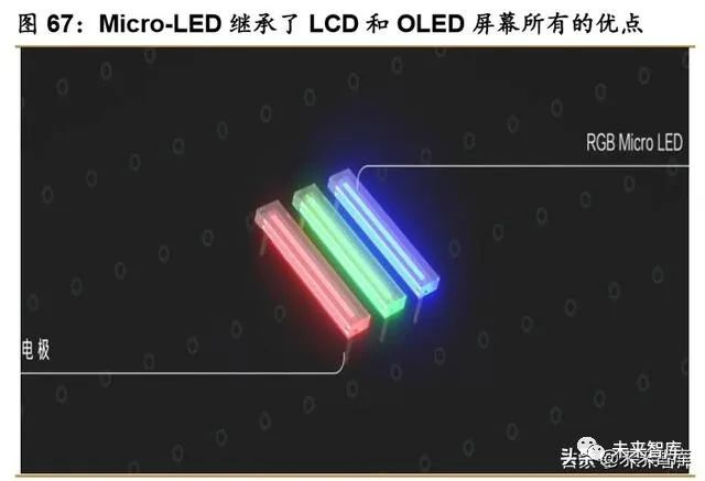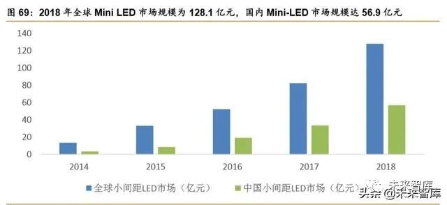 Micro-LED 和 Mini-LED 成为未来显示技术。Micro LED 指 LED 微缩化和矩阵化技术, 在一个芯片上集成高密度微小尺寸的 LED 阵列,使其体积约为目前主流 LED 大小的 1%, 可视为微小化的 LED。在 MicroLED 显示产品中,每一个像素点都是一颗 LED 芯片,会成 倍放大需求端空间,让众多 LED 芯片厂商产能迅速消化。这种显示技术继承了 LCD 不闪屏、 不烧屏、清晰度和 OLED 高功耗低、色彩鲜艳、响应时间快等几乎所有优点,技术一旦成熟 后可以替代 LCD 和 OLED 技术,缺点是制造成本和时间较长,屏幕所有灯珠需要自身一个 一个去种植,目前无法像实现大批量生产。Mini-LED 则是将一整块 LCD 层进行切割分出了 上百个背光区域,在一定范围内提升了对比度,削减了 LCD 屏幕的缺点,是一种对 Micro-LED 很好的过渡替代技术。据沙子利文数据中心测算,2018 年全球 Mini LED 市场规模为 128.1 亿元,国内 Mini-LED 市场规模达 56.9 亿元。
