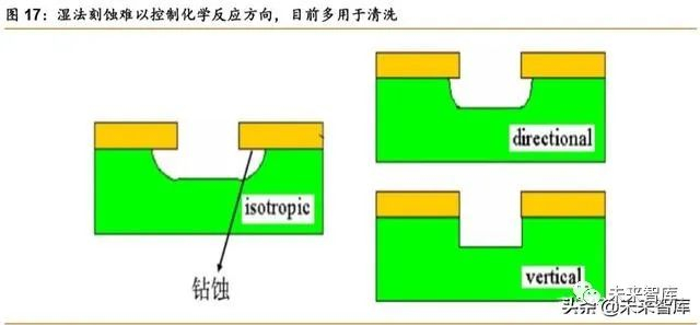 刻蚀可分为湿法刻蚀和干法刻蚀,干法刻蚀为当前主流。早期刻蚀技术是采用湿法刻蚀 的方法,主要是利用溶液与被刻蚀材料之间的化学反应,先使未被光刻胶覆盖部分的被刻蚀 材料分解和转变为可溶于此溶液的化合物,然后去除。湿法刻蚀的优点是工艺简单、设备简 单,而且成本低、产能高,具有良好的刻蚀选择比。但由于化学反应没有方向性,湿法刻蚀 会有侧向刻蚀而产生钻蚀现象,属于各项同性刻蚀。当集成电路中的器件尺寸越来越小,对 尺寸形貌的要求也越来越高,湿法刻蚀的各向同性导致的钻蚀现象也愈加严重,并造成图形线宽失真。因此,湿法刻蚀更多用于干法刻蚀之后残留物的去除。干法刻蚀是通过等离子气 体与硅片发生物理或化学反应(或结合物理、化学两种反应)的方式将表面材料去除,主要 用于亚微米尺寸下刻蚀,由于具有良好的各向异性和工艺可控性已被广泛应用于芯片制造领 域。